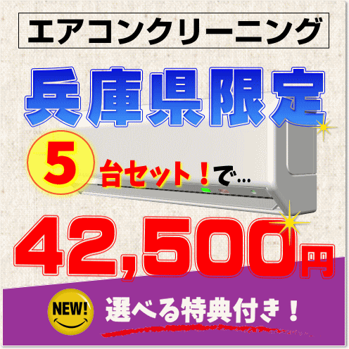 | 【兵庫県限定】家庭用エアコンクリーニング5台セットキャンペーン★[兵庫県]の方限定の選べるキャンペーン特典付き!エアコン内部を本格洗浄!嫌な臭いや内部のカビも徹底除去(出張施工)兵庫県(一部)にお住まいの方への限定サービスです♪ | |
