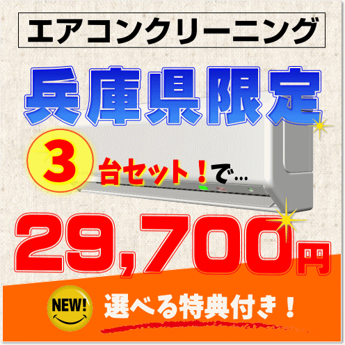 | 【兵庫県限定】家庭用エアコンクリーニング3台セットキャンペーン★[兵庫県]の方限定の選べるキャンペーン特典付き!エアコン内部を本格洗浄!嫌な臭いや内部のカビも徹底除去(出張施工)兵庫県(一部)にお住まいの方への限定サービスです♪ | |
